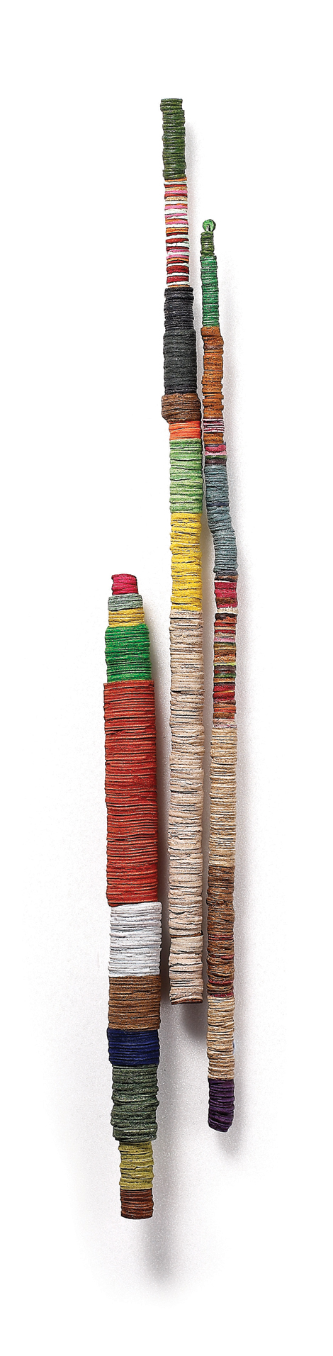 묘사적이기 보다 상징적이다. 늘어지거나 이어지는 끈, 시작과 끝이 없는 반복 형태들은, 작가가 바라보는 일상과 이들의 침전물, 때론 현실을 보상하는 꿈의 세계를 그리는 언어들이다. 이들은 보편적이면서도 개인적이다. 겹겹의 가죽 단층들에는 작가가 감내한 시공간의 변화와 단절, 이를 다시 이어가는 삶의 의지가 투영되어 있다.