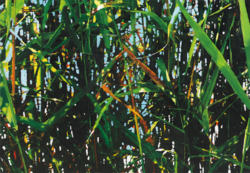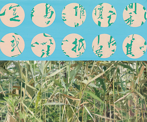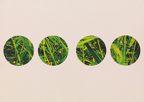작가는 무척 친절하게도 관람자들로 하여금 작품들이 단순한 풀을 모방한 것이 아니라는 메시지를 추상적인 표현으로 ‘보여’주고 있다. 캔버스 프레임 안의 원圓들이 그것이다. 풀들은 무성茂盛하게 있되, 지극히 단순한 선과 비율과 색채를 가진 일정한 원圓들의 안에 있다. 가끔은 프레임 가득 풀숲이고, 단순 원圓 이미지들이 몇 제시되기도 한다. 우리는 이 원을 통해서 풀들을 (들여다) 본다. 원圓은 우리의 눈이거나 렌즈lense이거나 스코프scope이다.
