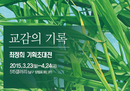 풀들이 부대끼며 서로가 서로의 그림자로 뒤섞여 있다. 그것들은 숲을 이루고 있다. 때로는 바람에 한쪽으로 모두들 쏠려 바르르 떠는 소리가 들릴 것만 같다. 때로는 저마다의 몸에 투영시킨 태양광으로 초록빛과 갈빛을 그림자 속에서 뒤섞기도 한다. 달빛 아래에선 초록의 빛을 흑백의 명암으로 대신하기도 한다. 이 ‘풀’그림들에 작가는 ‘교감’이라는 제목을 달아놓았다. 최정희 작가는 이번 전시회에 이르기까지 몇 해 동안 이 ‘풀’숲 이미지에 몰두하고 있다. 그리고 그 이미지들은 모두들 ‘교감’이란 제목이 달려있다. 풀잎들의 어울림은 삶의 온갖 교감들을 원관념으로 하는 이미지인 것으로 이해하면 되는 것일까? 작가가 풀잎의 겹침들과 그 빛들을 표현해내기 위해서 애써 수고롭게 작업한 과정을 존중하기에는 왠지 부족한 이해인 듯싶다.