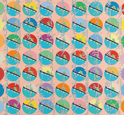 그의 작품이 건네는 소리를 들어보자. “이 나뭇‘가지들’을 보라. 그 위아래 하늘의 빛이 다름을 가르고 있지 않는가. 원圓들을 통해서 7×7 ‘가지들’을 보라. 당신이 보는 것들과 보고 있는 자신을 깨닫게 되는 진리의 빛이 보이지 않는가. 그리고 그 위 한 폭의 세계 전체를 덮고 있는 선과 면과 색의 코스모스Cosmos가 보이지 않는가. 그리고 원 안의 나뭇가지 아래 작은 물방울들 속에 담긴 온 세상과 그 위로 푸른빛의 새로 돋는 싹이 우주처럼 보이지 않는가.” ▲