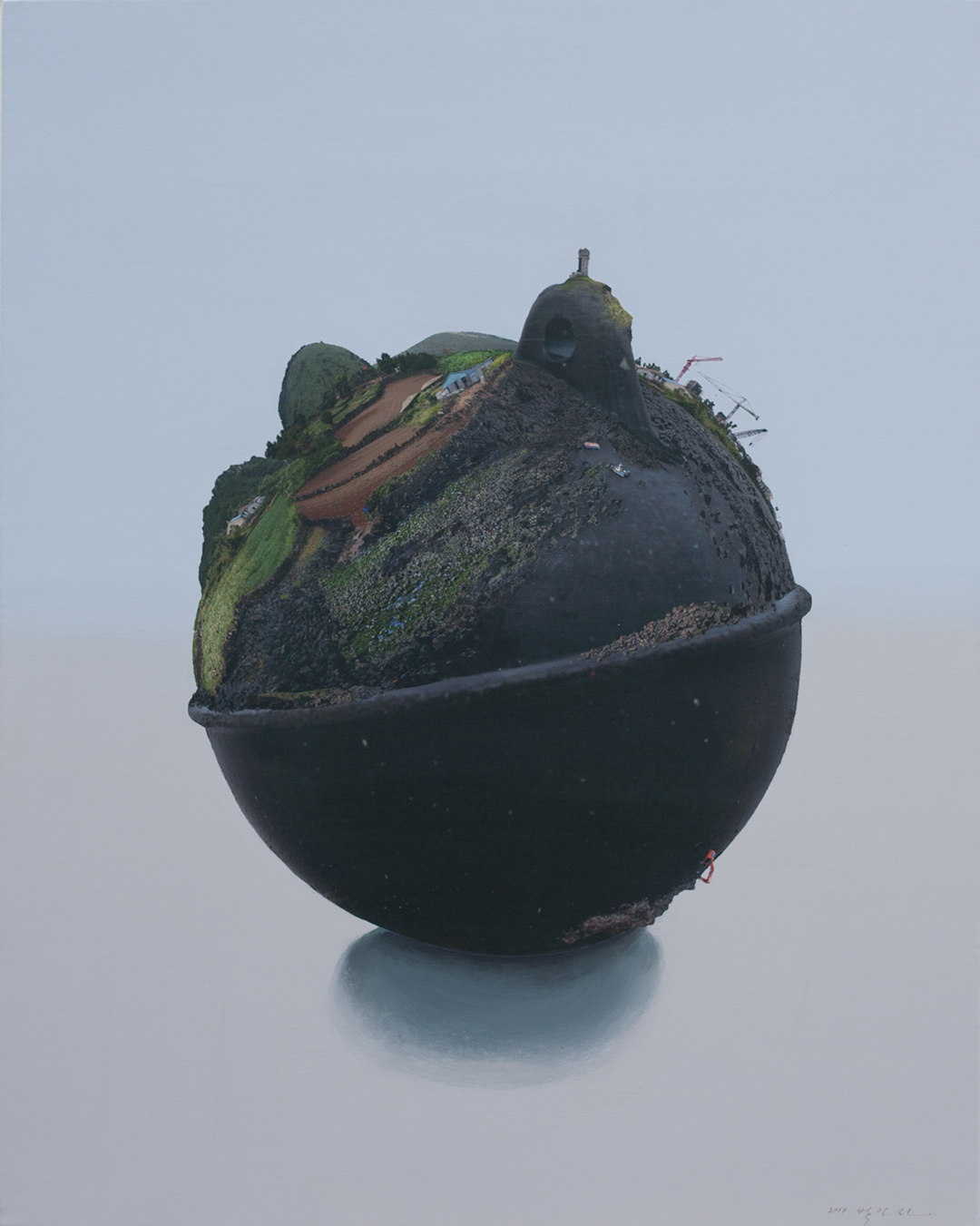 선보인다. 지구가 연상되는 ‘구’의 표면이 콘크리트로 둘러싸여 있기도 하고, 나무가