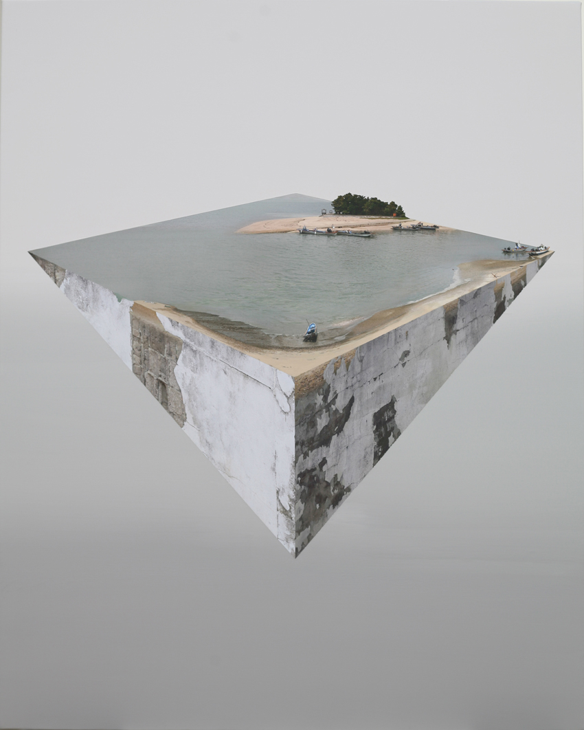 집을 뚫고 나오기도 하며, 사각뿔로 잘려진 건물 위에 바다나, 대지가 펼쳐진다. 그는